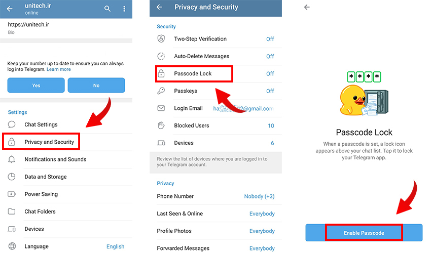 - گزینه Passcode Lock را فعال و یک رمز عبور تعیین کنید.