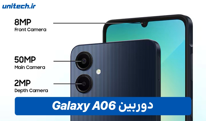 سیستم دوربین گوشی سامسونگ A06 دوگانه بوده و متشکل از یک دوربین اصلی ۵۰ مگاپیکسلی از نوع عریض با دیافراگم f/1.8 و قابلیت PDAF و دوربین ۲ مگاپیکسلی از نوع عمق سنج است. این گوشی قادر به فیلمبرداری Full HD (1080p) با سرعت ۳۰ فریم بر ثانیه است. دوربین سلفی ۸ مگاپیکسلی نیز برای تماس های ویدیویی و سلفی کافی است.