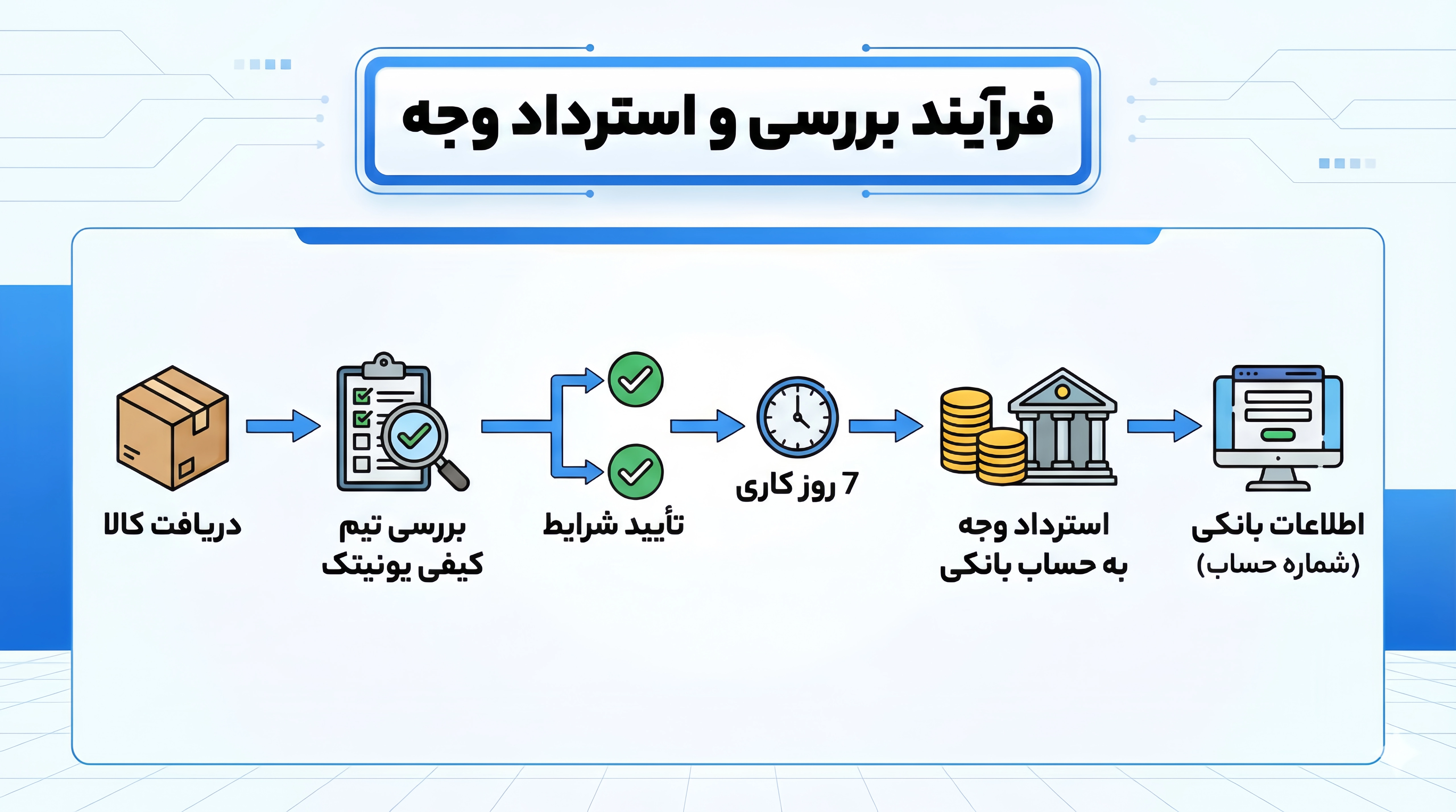 سیاست‌های بازگشت کالای یونیتک با هدف ایجاد اطمینان خاطر برای مشتریان عزیز طراحی شده‌اند. ما متعهد هستیم که هرگونه نارضایتی را با جدیت پیگیری کرده و بهترین خدمات را ارائه دهیم. هدف ما این است که شما با خیالی آسوده خرید کنید و در صورت نیاز به بازگشت، فرآیندی ساده و شفاف داشته باشید.