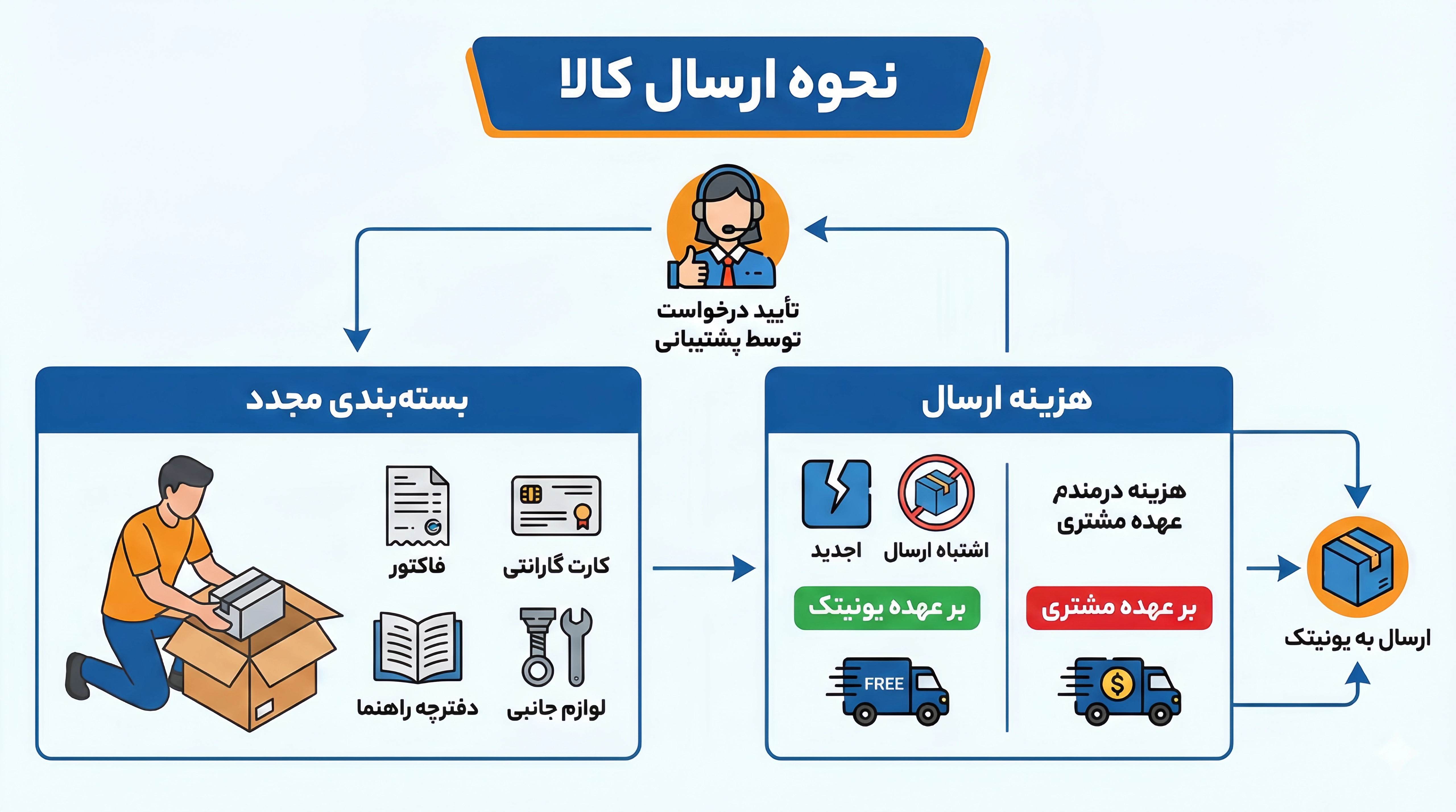 هزینه ارسال بازگشت کالا در صورتی که محصول آسیب‌دیده یا اشتباه ارسال شده باشد، بر عهده یونیتک است. در غیر این صورت، مشتری باید هزینه ارسال را پرداخت کند.