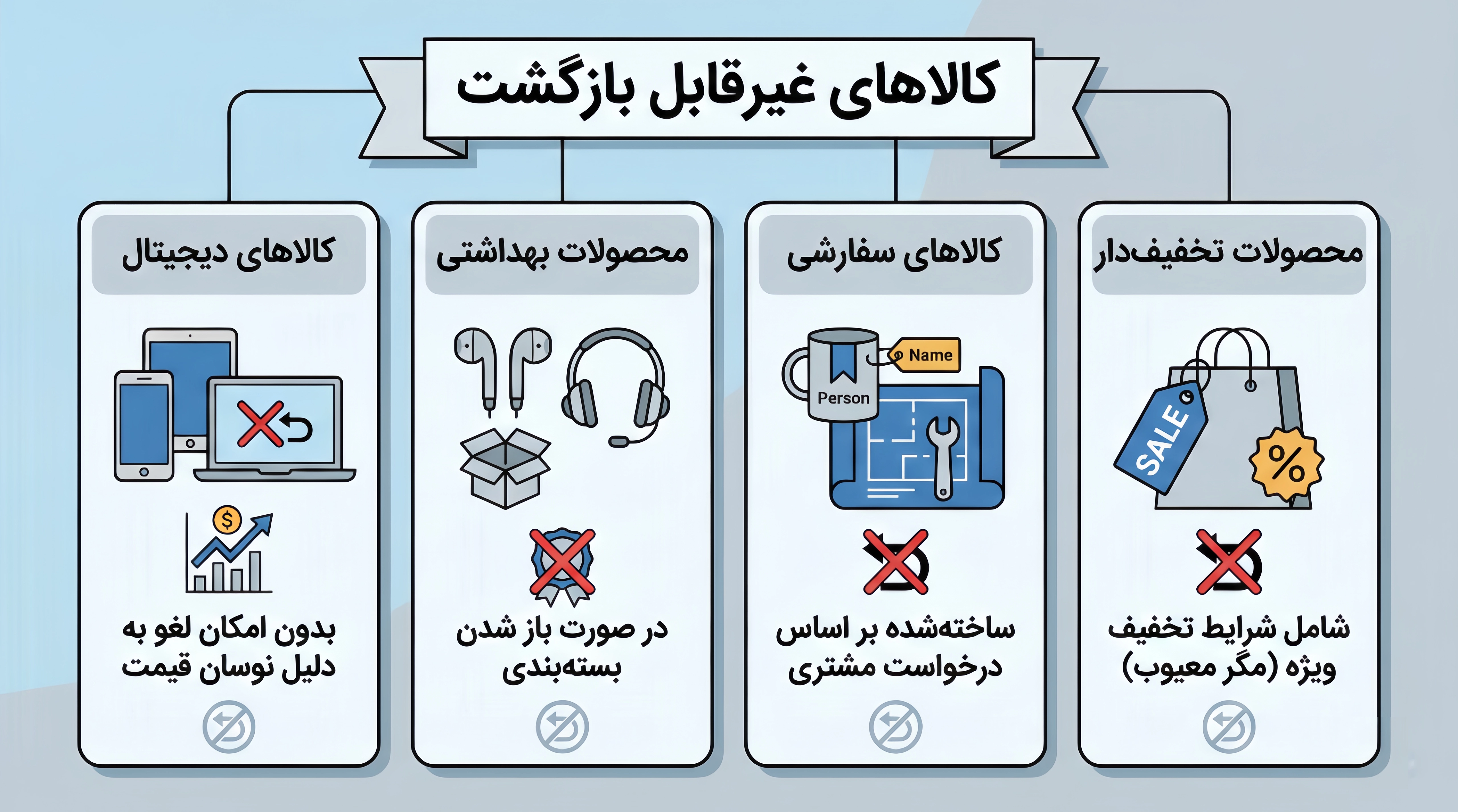 برخی از کالاها به دلیل مسائل بهداشتی و سلامت یا ویژگی‌های خاص خود، غیرقابل بازگشت هستند: