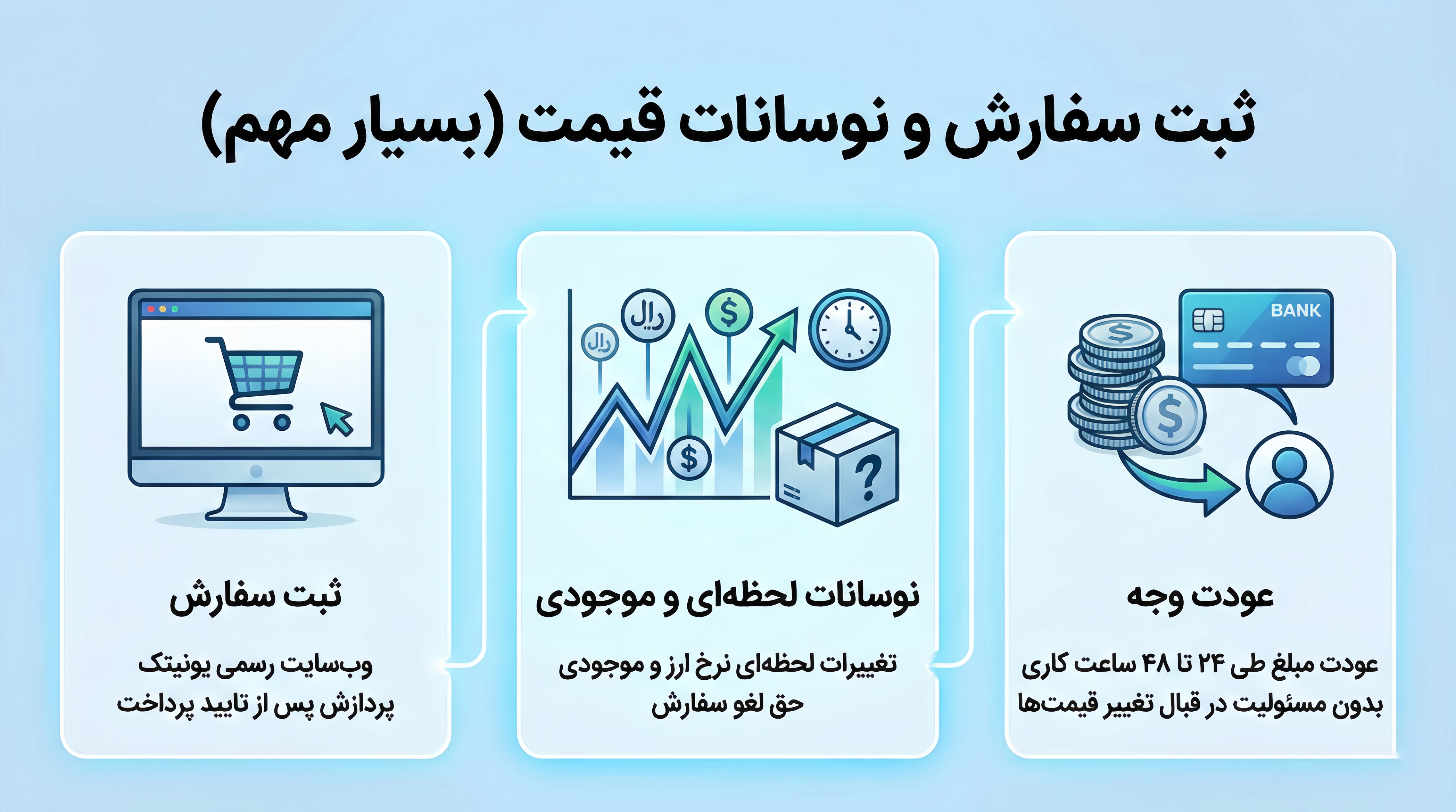 با توجه به نوسانات نرخ ارز و تغییرات لحظه‌ای موجودی بازار، در صورتی که پس از ثبت سفارش و پرداخت، موجودی کالا به پایان برسد یا قیمت کالا تغییر کند (و مشتری تاییدیه نهایی را نگرفته باشد)، یونیتک حق دارد سفارش را لغو کند.