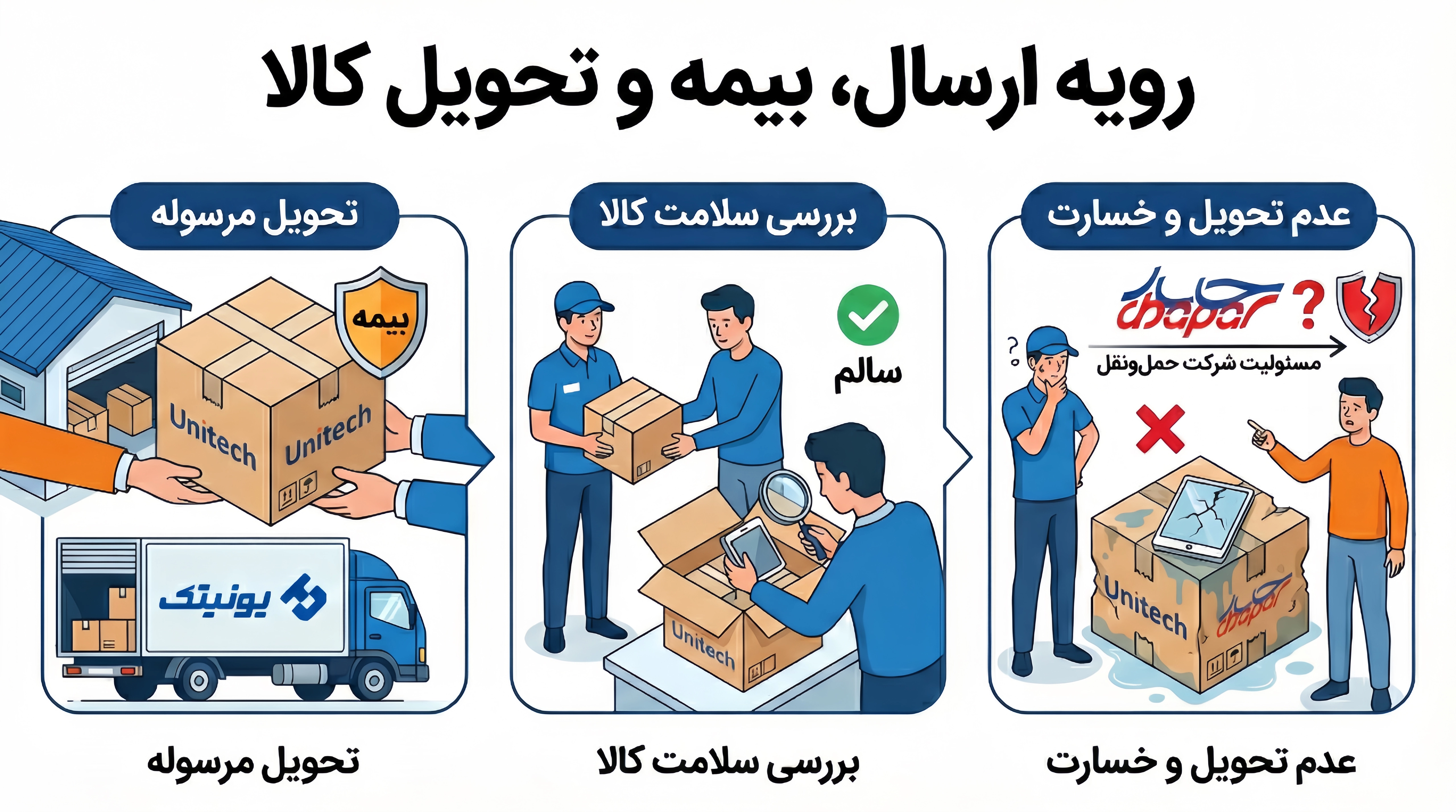 کلیه مرسولات تحت پوشش بیمه شرکت حمل‌ونقل هستند. هرگونه آسیب یا خسارت احتمالی پس از تحویل کالا به پست/تیپاکس، بر عهده شرکت حمل‌ونقل مربوطه بوده و یونیتک مسئولیتی در قبال حوادث حمل‌ونقل یا سقف تعهدات بیمه پست ندارد. (توجه: ارسال با پست پیشتاز معمولاً دارای سقف بیمه محدودتری نسبت به تیپاکس است).