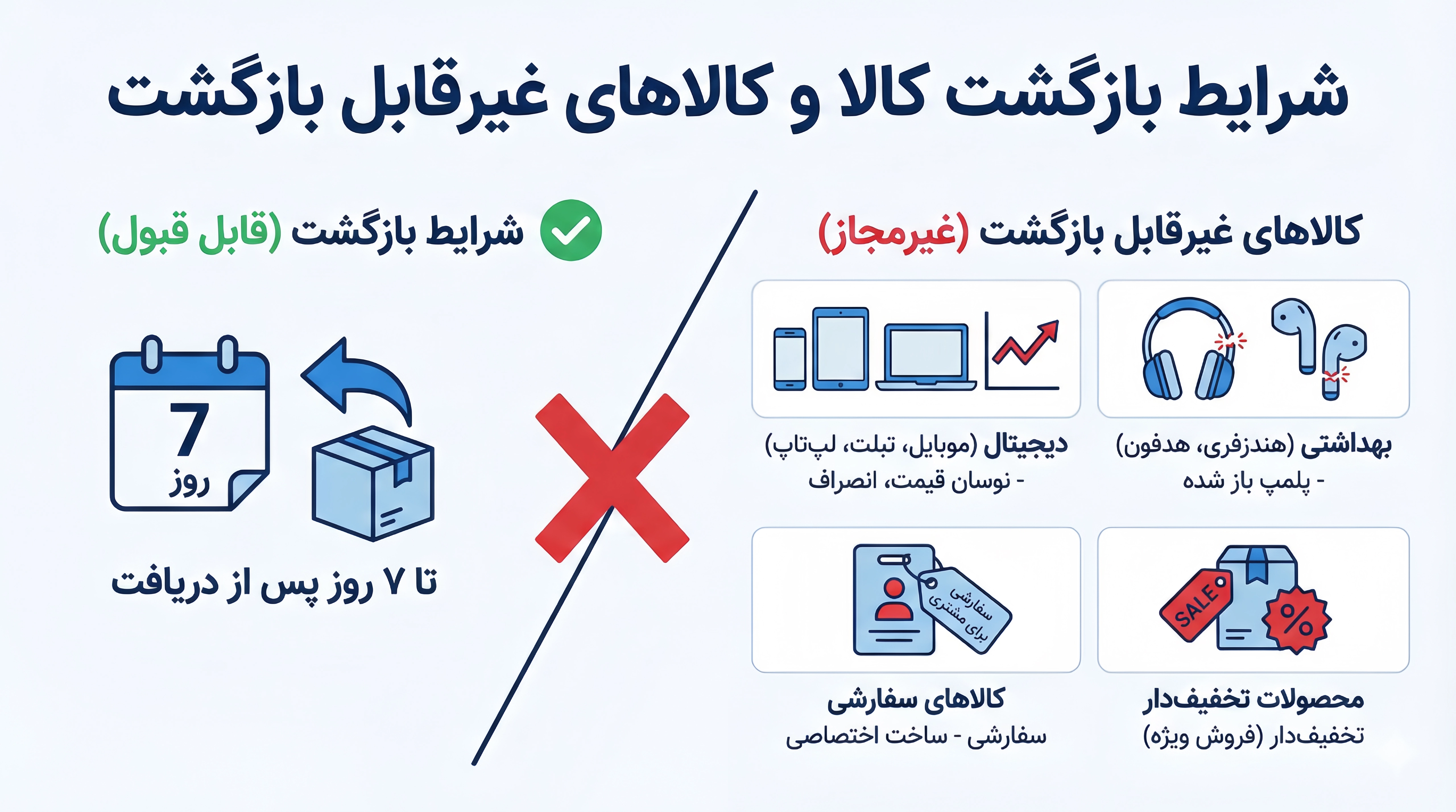 مشتریان می‌توانند تا ۷ روز پس از دریافت کالا، درخواست بازگشت کالا را ثبت کنند، مگر در موارد زیر که کالا غیرقابل بازگشت است:
